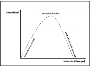 Aquesta gràfica explica de forma senzilla com funciona l’ansietat. Aquesta apareix en un determinat moment (després d’una situació, persona, lloc, pensament, etc.) manifestant-se a través dels seus símptomes i, a mesura que avancen els minuts, va augmentat la seva intensitat. Per exemple, si vaig a agafar un avió, de camí a l’aeroport començo a sentir-me malament, a pensar que agafar un avió no és segur i que em fa molta por; a mesura que va arribant el moment d’entrar a l’avió i seure la meva ansietat va a més, em sento pitjor.